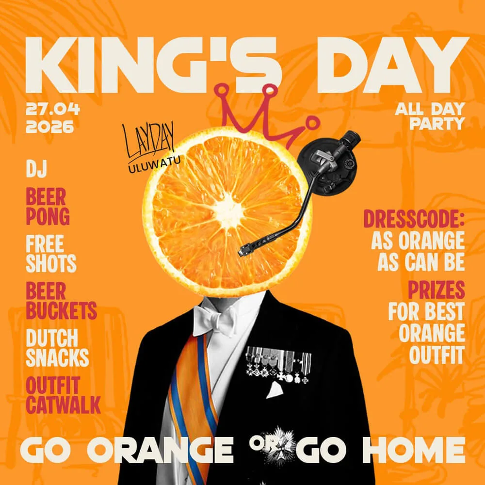 Ben je in Uluwatu en wil je Koningsdag vieren zoals het hoort? Dan is Lay Day in Uluwatu jouw plek. Het hostel kleurt volledig oranje voor een dagvullende Kingsday takeover met de echte energie. Geen halfbakken themafeestje, maar gewoon keihard feest van ’s ochtends tot ’s avonds. Verwacht de hele dag een DJ, beerpong battles, gratis shots, bierbuckets, Nederlandse snacks én een outfitcatwalk waarbij de beste oranje outfit een prijs wint. Of je nou de hele dag blijft, of je komt meeten voor pre-drinks. Dit voelt als thuis.