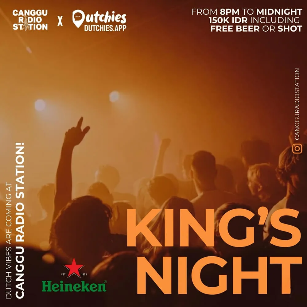 Na het legendarische succes van vorig jaar konden we natuurlijk niet anders. We doen het dit jaar gewoon weer (en nóg dikker)! Voordat de waanzin van Koningsdag echt losbarst, trappen we af met een legendarische Kingsnight. Canggu Radio Station verandert voor deze avond in een oranje gekte. We halen een Nederlandse DJ in huis die al je favoriete hits van eigen bodem draait, perfect voor een avond volop meezingen. Reken op geweldige muziek, een goede dosis energie en een interactieve spelletjesavond om de sfeer er goed in te houden. Breng je eigen crew mee of kom lekker solo en vind hier je squad. En vergeet natuurlijk niet je beste oranje outfit aan te trekken! Het aantal tickets is beperkt dus zorg dat je er snel bij bent!